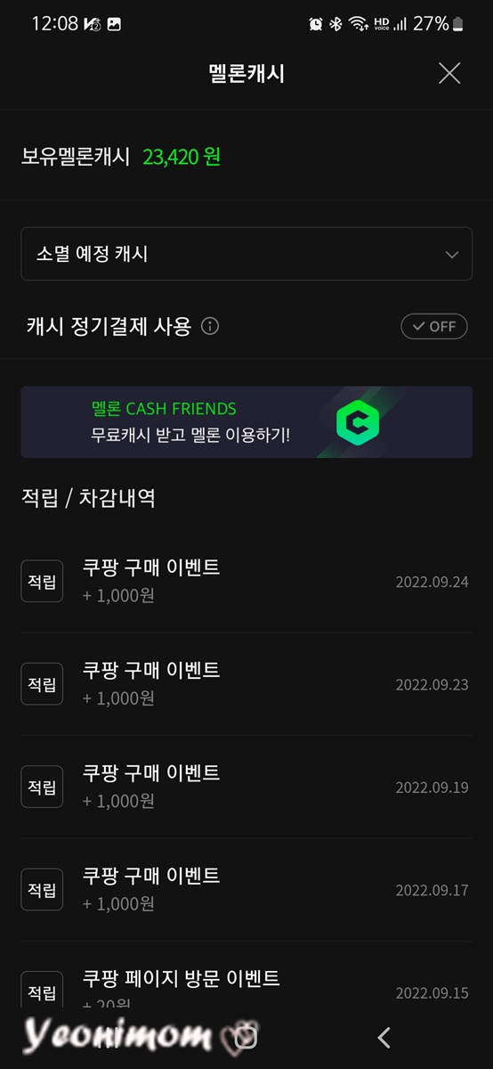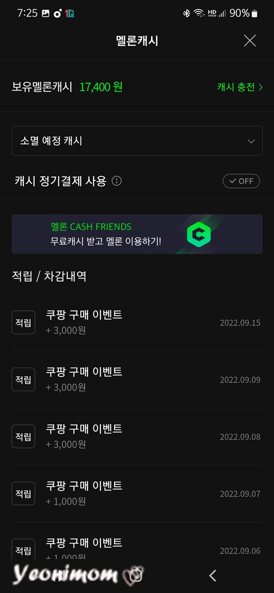 특히 쿠팡을 아주 잘 사용한다면 아주 쏠쏠한 멜론 캐쉬를 모을 수 있습니다.