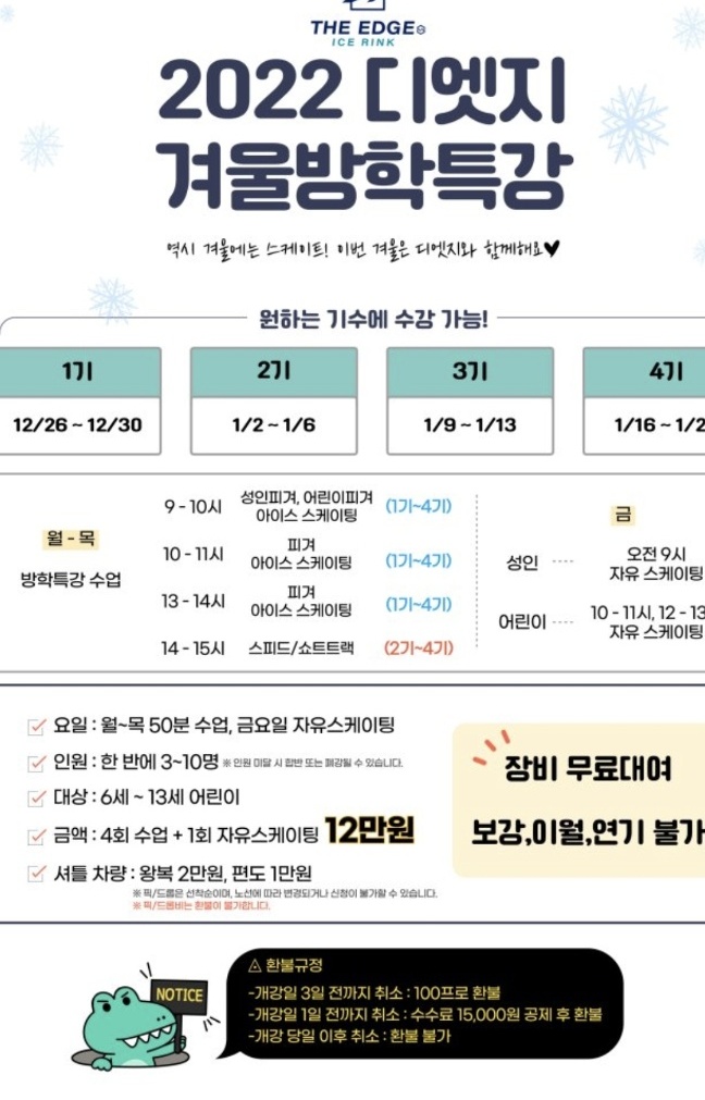디엣지 아이스링크 겨울방학특강은 3기, 4기 신청가능하고 3기가 1월 9일~13일, 4기가 16일~20일까지 5일씩 수업입니다. 여긴 하루에 50분 수업이네요. 50분씩 4번 강습 1회 자유스케이팅해서 12만원에 대여료는 포함된 수강료입니다. 자유스케이팅까지 포함한다고 해도 시간당 24,000원으로 가장 비싸긴 합니다. 4시간 수업해서 많이 늘까 싶기도 해서 조금 망설여지는 곳이었어요. 그래도 셔틀이 있어서 조금 큰 애들은 셔틀 태워서 보내고 혼자 보낼 수 있어서 엄마는 조금 편하지 않을까 싶기도 해요. (셔틀도 비용이 추가라는 점..ㅠㅠ) 다른데랑 다르게 오후에도 수업이 있어서 시간의 선택 폭도 좀 넓은 것 같고 강동이나 강남쪽에서는 조금더 접근성이 좋아보이기도 합니다. 오후에는 쇼트트랙 수업도 있어서 쇼트트랙에 관심있으면 좋을 것 같네요~