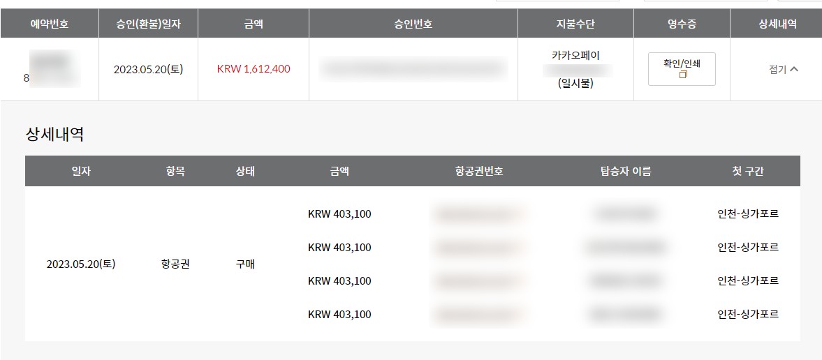 최종 인천-싱가포르 왕복 아시아나항공 직항으로 365,600원으로 구매하였다.