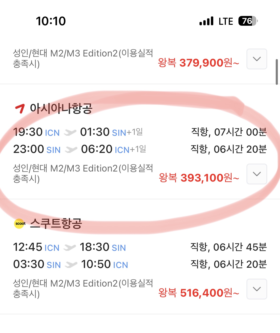인천 - 싱가포르 직항 아시아나 가격이 39만원으로 무려 20만원이 절약되어진다. 아시아나 공홈에서 확인해도 403,000원정도!