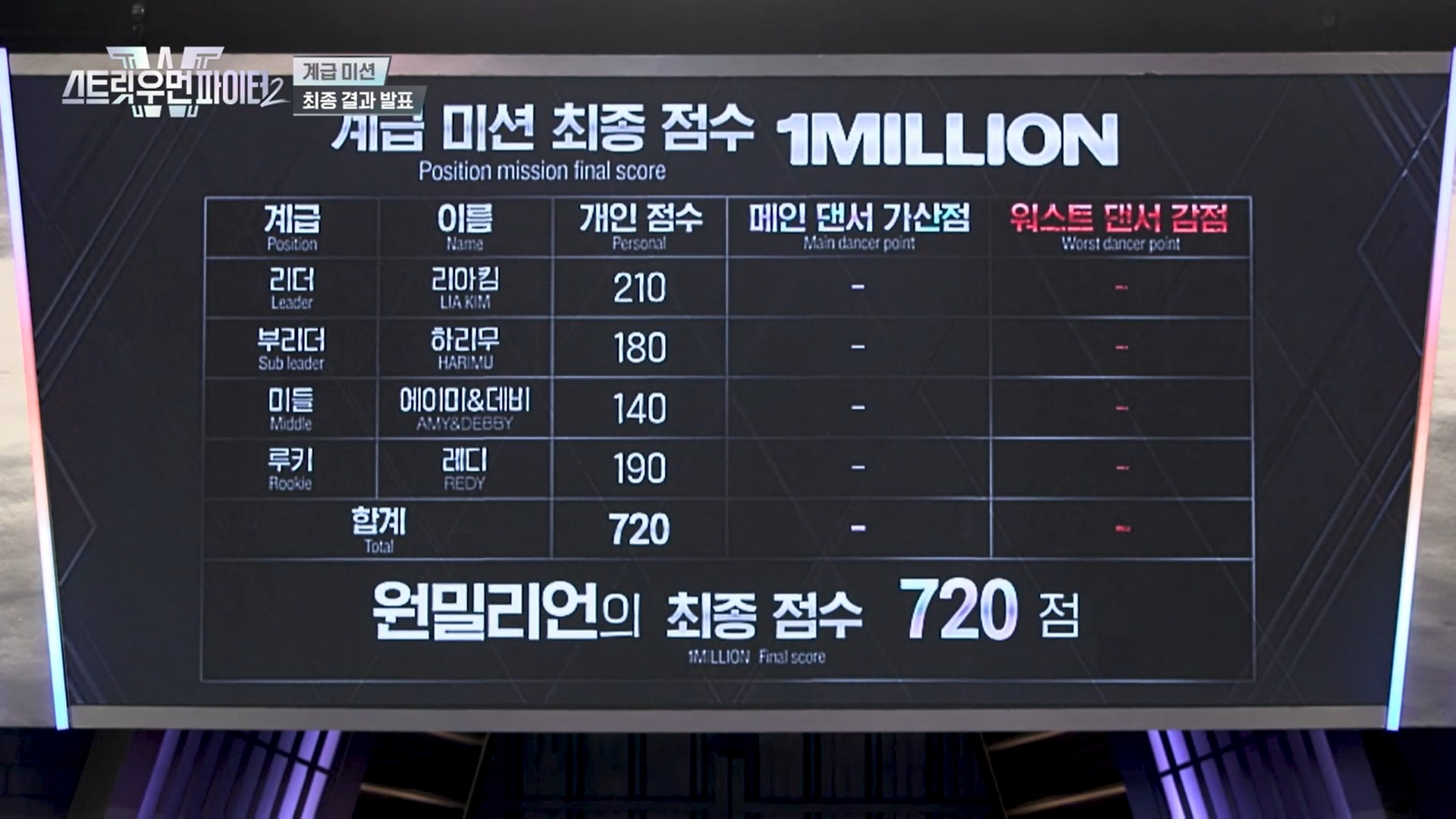 원밀리언. 생각보다 너무 점수를 못받았다. 뭐 눈에 띄게 하는 사람이 없었으니까. 그나마 리아킴쌤인데 힘들어뵌다. 나이도 있으시고 그동안 이렇게 빡시게 경쟁하는거 많이 안하셔서 힘드시지 않을까 싶은...