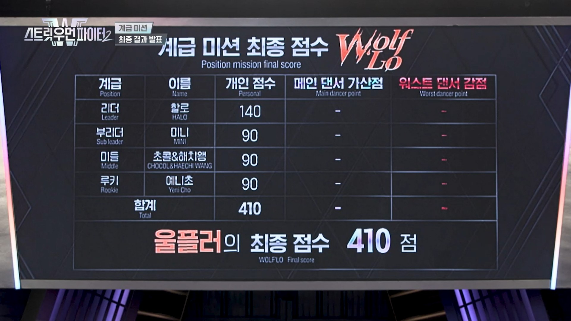 이렇게 정리하고 보니까 개인별 점수의 합이 전체 크루의 순위와 똑같다. 메인댄서 가산점이나 워스트댄서 감점이 무색하게 개인 점수의 순위 그대로 계급미션 결과 순위가 결정된! 괜히 기분만 나쁘게 워스트 댄서나 선택하고... 의미없다~~