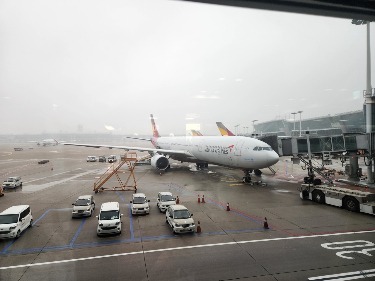 살짝 비는 내리고 있지만 정상적으로 출발하길 바라는 우리 비행기! 잘 부탁한다.