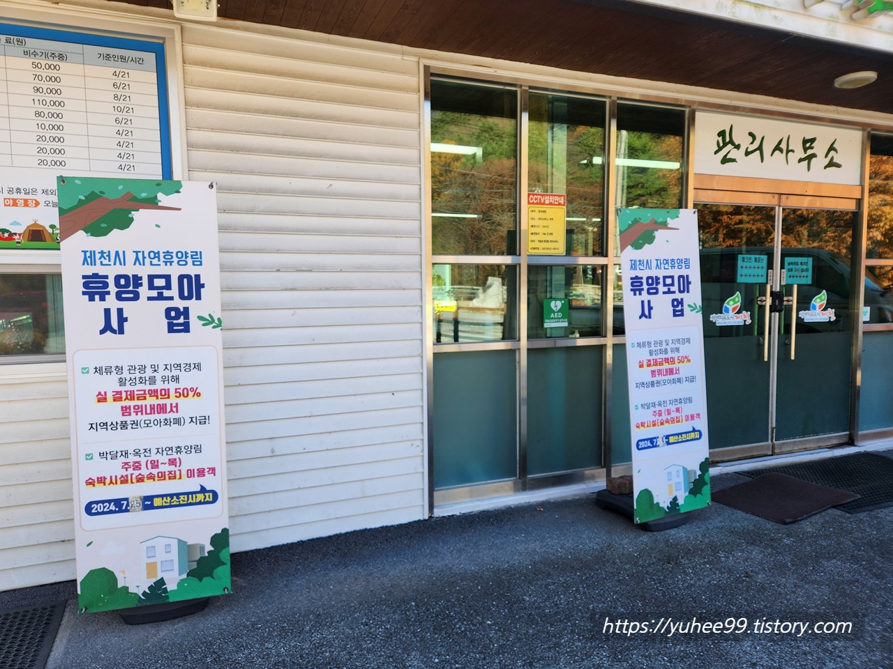 전국 자연휴양림에서 숙박시에는 신분증을 제시해야하는데 제시하니 제천과 자매결연된 곳이라고 숙박요금을 50%할인을 해준다고! 이미 결제한 것 중 50% 는 곧 취소되서 들어올 것이라고 안내해주신다.