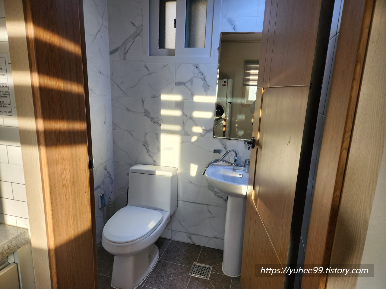 박달재 휴양림 금봉 4호 , 4인실의 화장실. 사이즈가 좀 작다. 변기, 세면대 있고 따로 샤워 파티션은 없고 세면대 수전에 연결된 샤워기로 샤워는 가능하다. 문을 열면 자꾸 슬리퍼가 걸려서 잘 벗어놓지 않으면 다음사람이 불편한 부분도 참고.