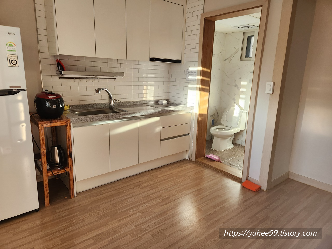 냉장고 , 커피포트, 밥솥 하이라이트 등이 보이고 주방 식기는 수저나 밥그릇 앞접시 국그릇 등은 있고 스텐 물컵은 있는데 머그컵은 따로 없어서 아침에 커피한잔 드실라믄 따로 컵을 챙겨가거나 스텐 컵에 먹어야하는 ...