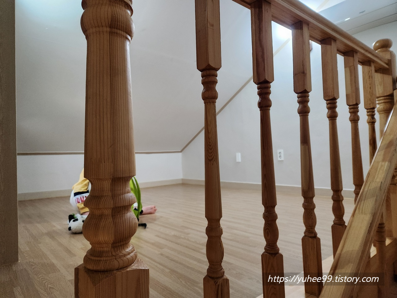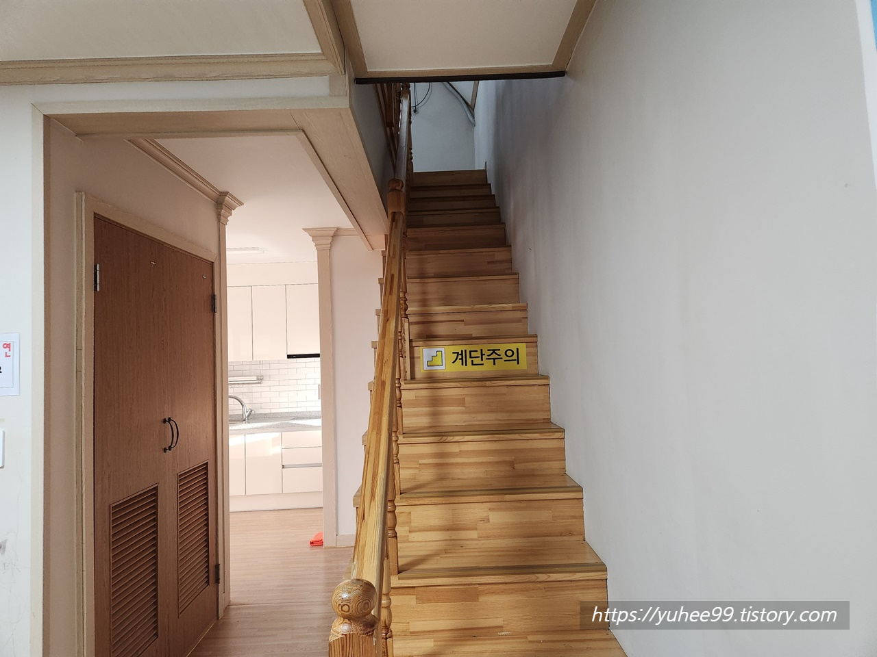 주방과 거실을 잇는 공간에는 이불장이 있어서 이불과 배게등을 꺼낼 수 있고 그 옆에 2층으로 올라갈 수 있는 계단, 다른 휴양림들 보다 계단은 덜 가팔라서 아이들이 올라다니기에도 크게 무리는 없는 구조