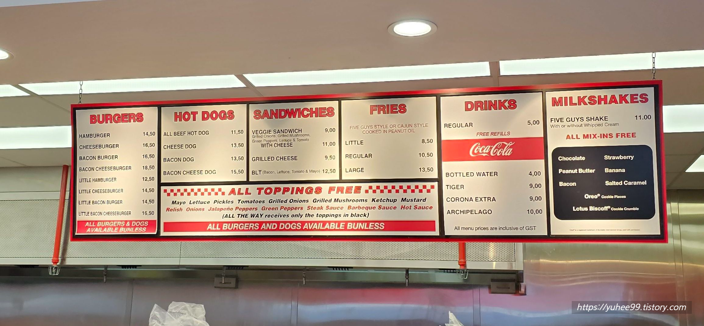 그래도 Five Guys는 다른 싱가포르 식당들은 메뉴판 금액에서 추가로 서빙차지랑 택스랑 붙어서 10프로 가까이 추가되었는데 요기는 메뉴판 가격 그대로 결제되니 그나마 위안?