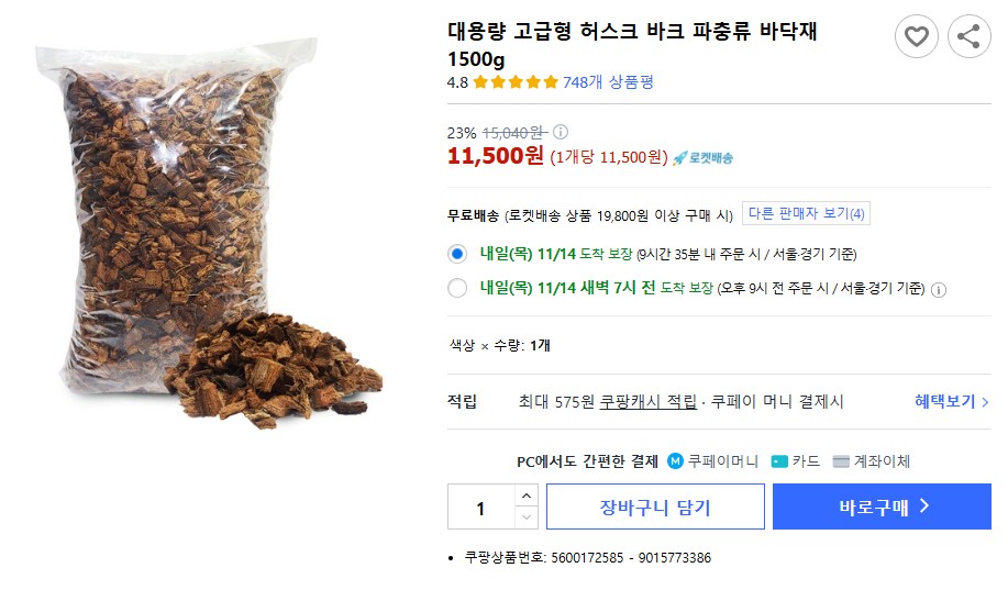 바로 첫날 깔아주고 싶었으나 주변에 파는데가 없어요.. 다이소도 가보고 이마트 애완 코너도 가봤는데 코코넛 바닥재는 이제 안판다고 하네요. ㅠㅠ 크랩 키우기 사육세트에 있긴 한데 배송이 하루 이틀 더 걸리는 상황이라 바닥재에 파고들어가는 것을 좋아한다는데 바닥재가 없고 , 플라스틱 통에서 걸어댕기니 너무 달그닥 거려서 하루라도 빨리 좀 스트레스 덜 받으라고 쿠팡으로 급하게 당일배송 주문해 보았어요. 코코넛 허스크칩 1.5kg 짜리로 주문~ 역시 쿠팡이라 다음날 바로 도착해서 두둑히 깔아주었어요~