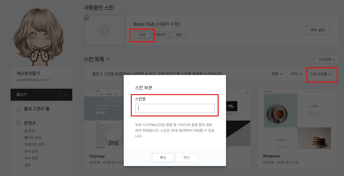 - 스킨변경 > 사용중인 스킨에서 보관 버튼 눌러서 저장. 난 그날 날짜로 저장하는 편. 수정 후 이상없으면 일주일이나 한달 후에는 삭제해서 정리해주도 한다.