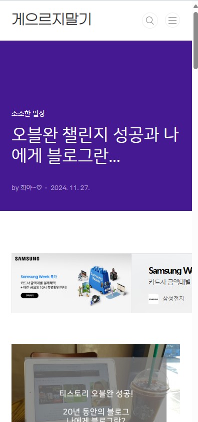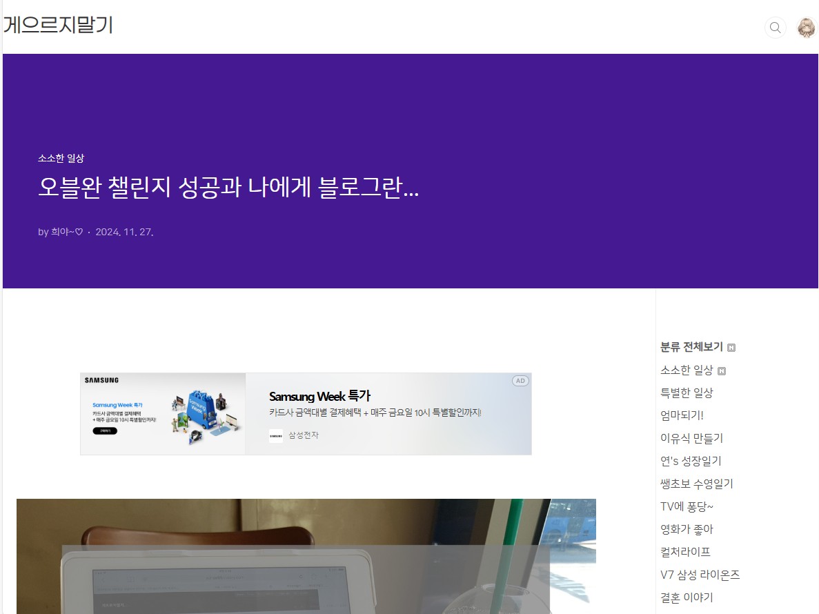 | 오블완 챌린지 성공과 나에게 블로그란... (7) | 2024.11.27 |
