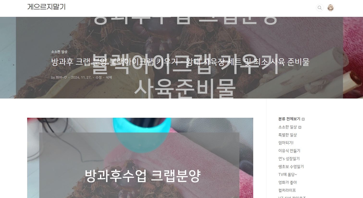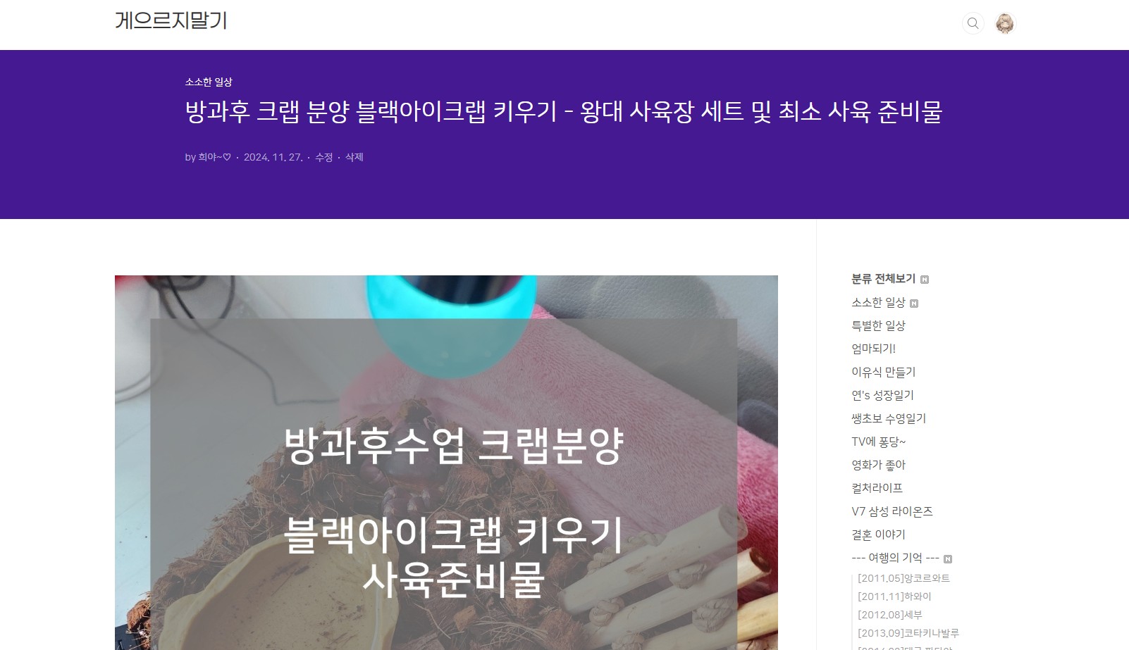 | 방과후 크랩 분양 블랙아이크랩 키우기 - 왕대 사육장 세트 및 최소 사육 준비물 (3) | 2024.11.27 |
