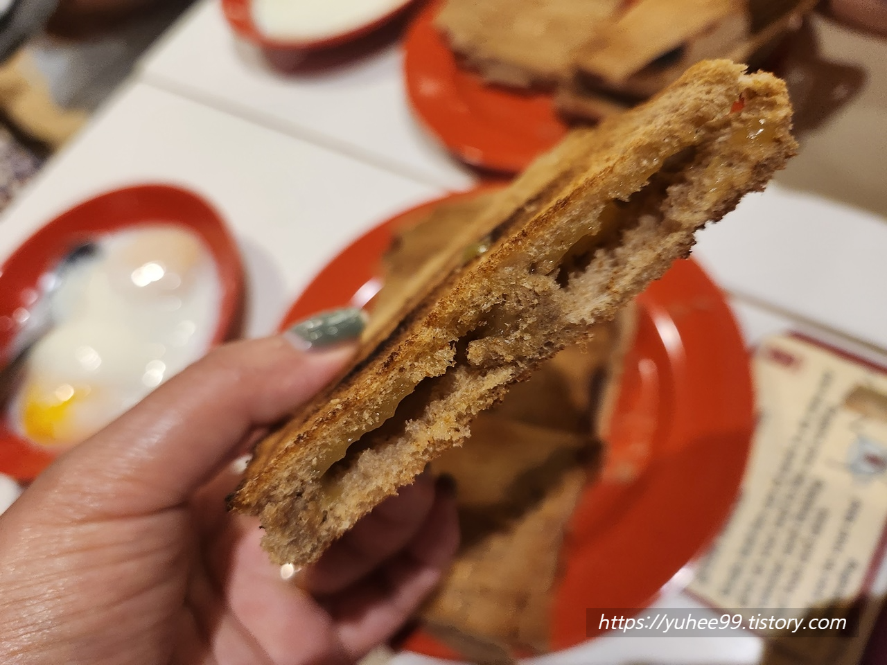Yakun Kaya Toast 야쿤 카야토스의 비주얼! 호밀빵느낌? 좀더 고소한 빵에 카야쨈도 듬뿍이고 테두리 부분을 잘라내지 않아서 좀 더 사이즈도 크다. 사이즈가 큰만큼 버터가 좀 일부 몰려있는 느낌도 좀 있기도~