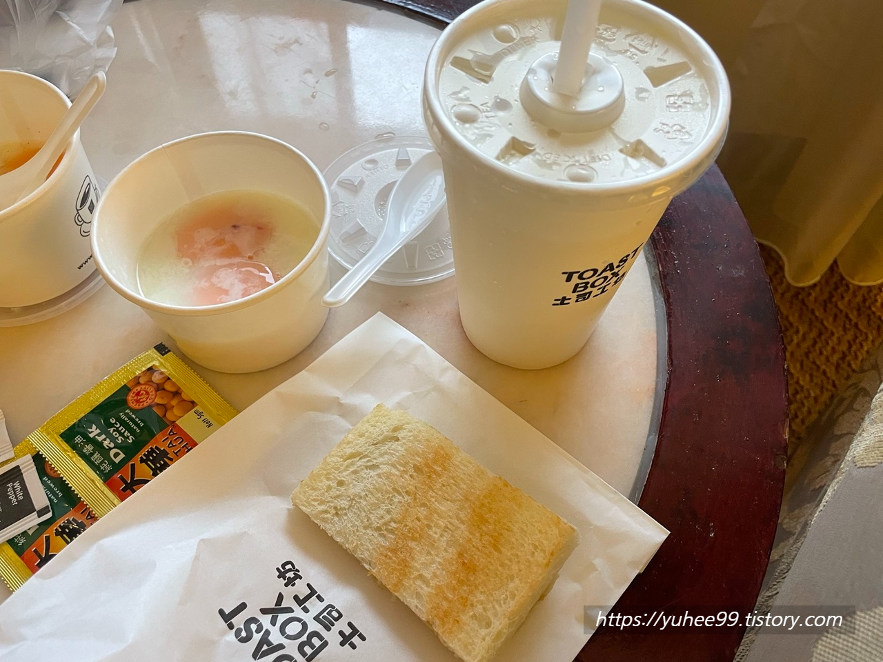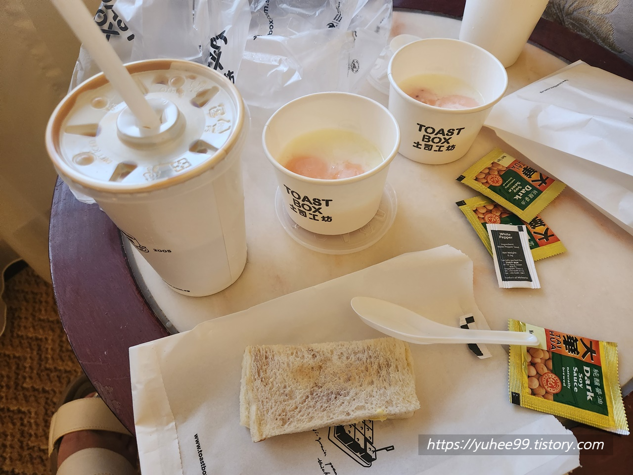 토스트 선택 시 세트로 주문하면 수란같은 달걀과 커피나 티가 함께 제공되어진다. 우리는 세뚜세뚜로~~ 하여 포장하여 호텔방으로 이동! 호텔로 돌아가려다가 갑자기 비가 너무 와서 걸어갈 수가 없어서 급하게 그랩을 불러서 이동해서 이후 사진은 거의 없긴하다.