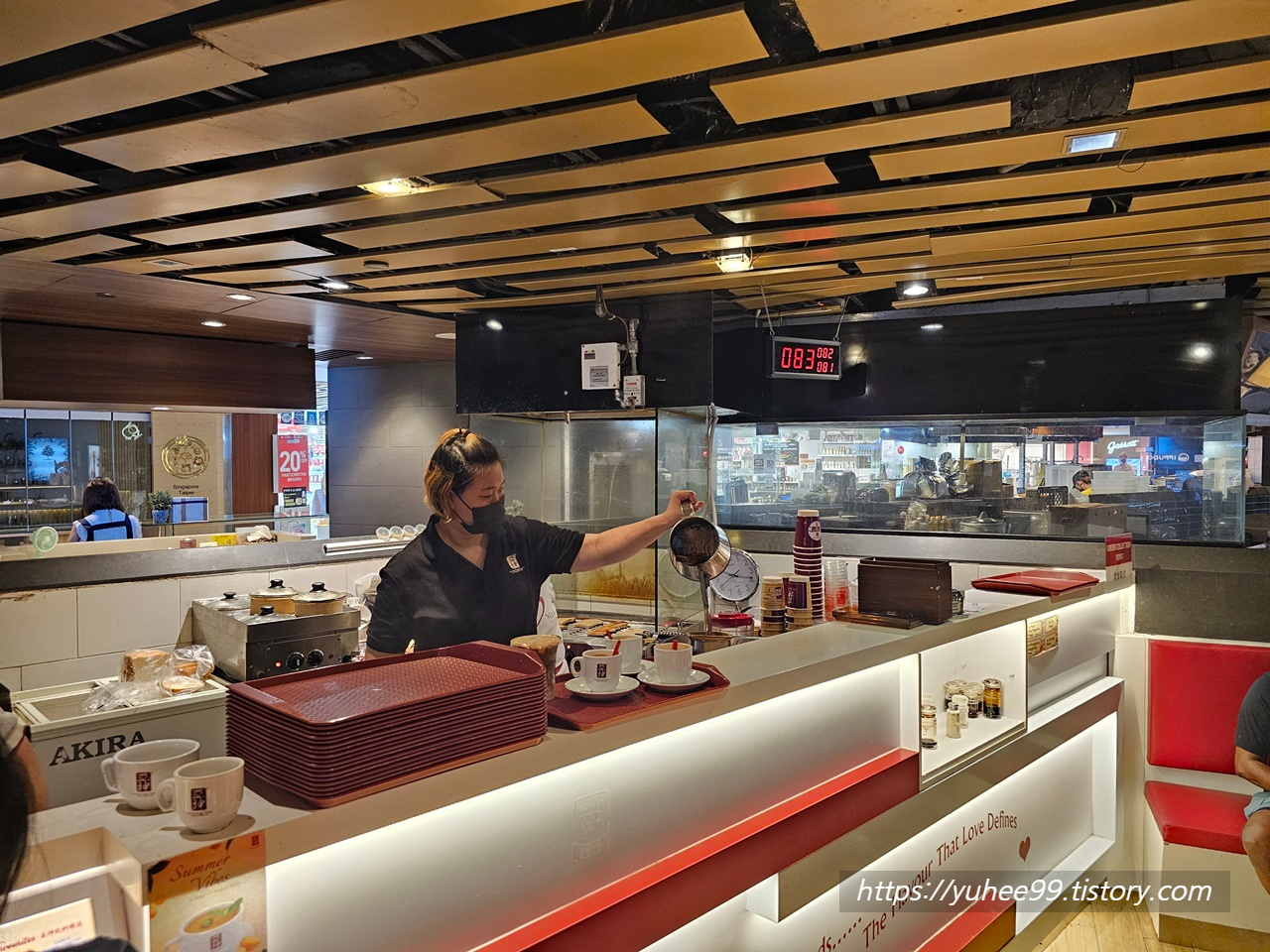 Yakun Kaya Toast 야쿤 카야토스에서 먹은 커피도 맛있었다. 커피는 먹는동안 매장에서는 끊임없이 커피를 만들고 계신다. 커피를 하늘높이 올려서 위에서부터 조로로로록 따라주는 퍼포먼스! 눈길을 사로잡으면서.맛도 있고 냄새도 좋고~