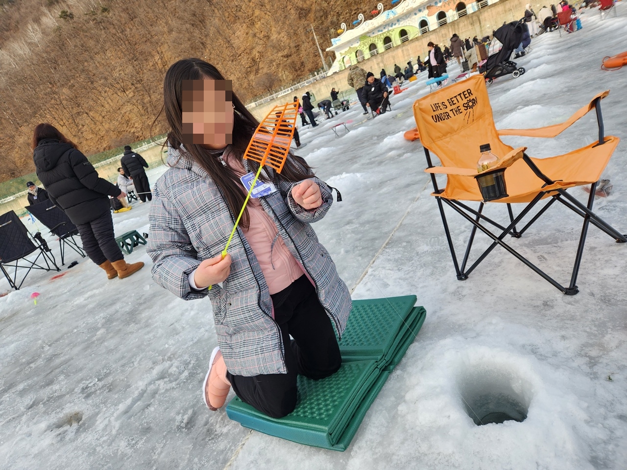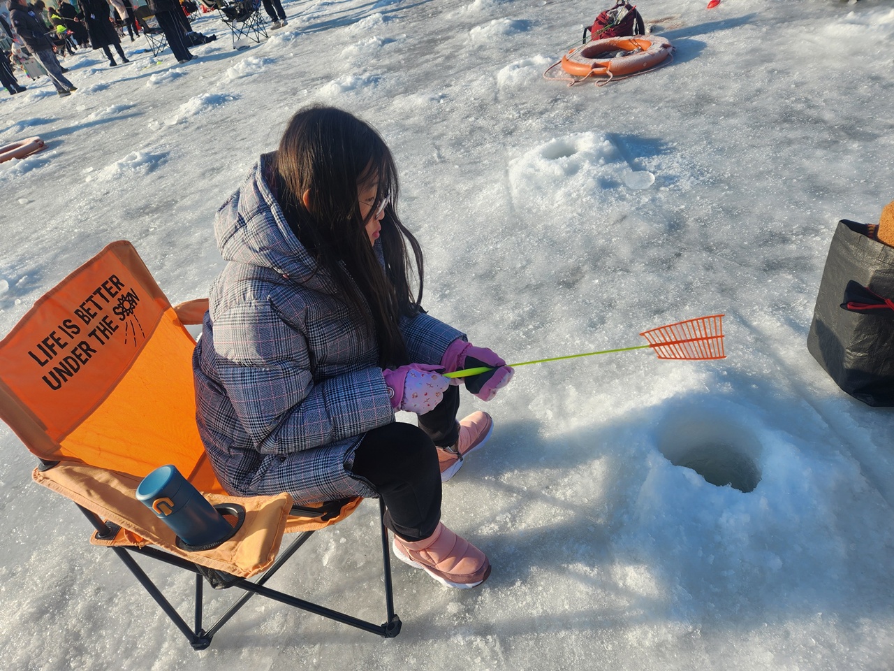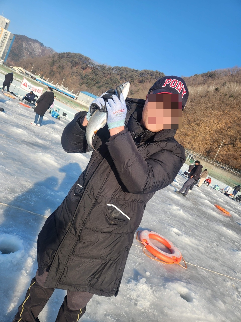 예매 내역 확인 하고 바로 낚시터에 입장하면 낚시터에 동그랗게 낚시 구명은 다 뚫려 있어요. 근데 뚫어놓은지 좀 된 경우 위에 살얼음이 다 껴있어서 얼음 뜰채로 얼음은 다 걷어내고 시작해봅니다.